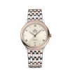 This stainless steel and 18K red gold model features a PVD linen colour sun-brushed dial on an embossed vertical structure that is encircled by a “railway” minute track. With a date window at 6 o’clock, the applied OMEGA logo, the alternating Roman numerals and cabochons are PVD blackened, along with the hands.
