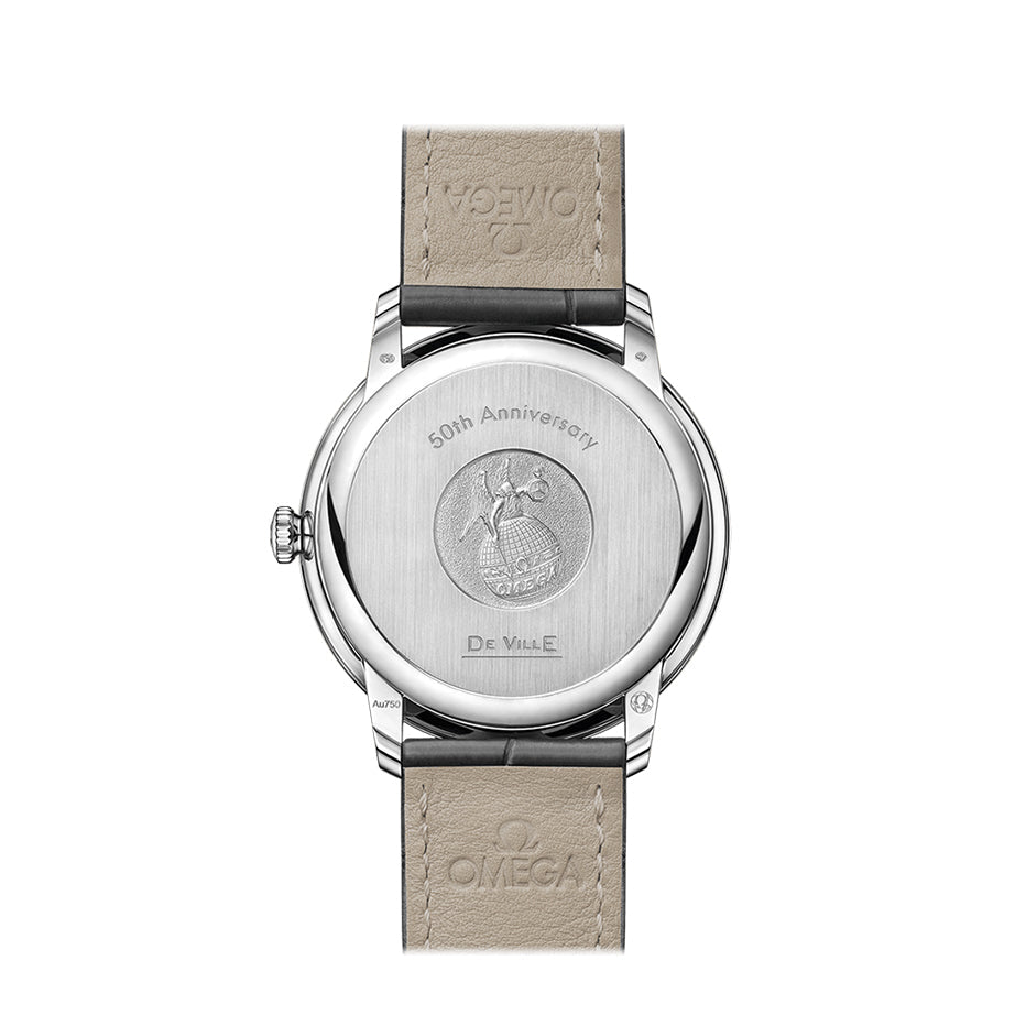 The vertically-brushed caseback is embossed with a God Chronos medallion and engraved with “DE VILLE” and “50th ANNIVERSARY”