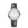 This model features a white enamel dial with Anthracite Arabic numeral hour-markers, apart from the 12 which is picked out in bold red. There is also an Anthracite inner “railway” minute track, with red lozenge prints at 15-45-60 minutes. A domed scratch-resistant sapphire crystal protects the striking dial, which is decorated with a date window at 6H.