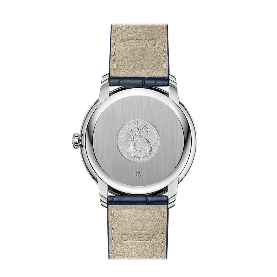 Surrounding the scratch-resistant sapphire crystal, the stainless steel bezel is mounted on a 39.5 mm case, which is presented on a blue leather strap. At the heart of this timepiece is the OMEGA Co-Axial Calibre 2627.