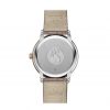 This model features an ivory silvery dial with a silk-like pattern and an opaline finish. The hands are gold-plated and the hour-markers include six gold-plated cabochons as well as gold-plated Roman numerals. There is a date window at 3 o’clock and separate displays for the small-seconds at 9 o’clock and the power reserve at 6 o’clock.