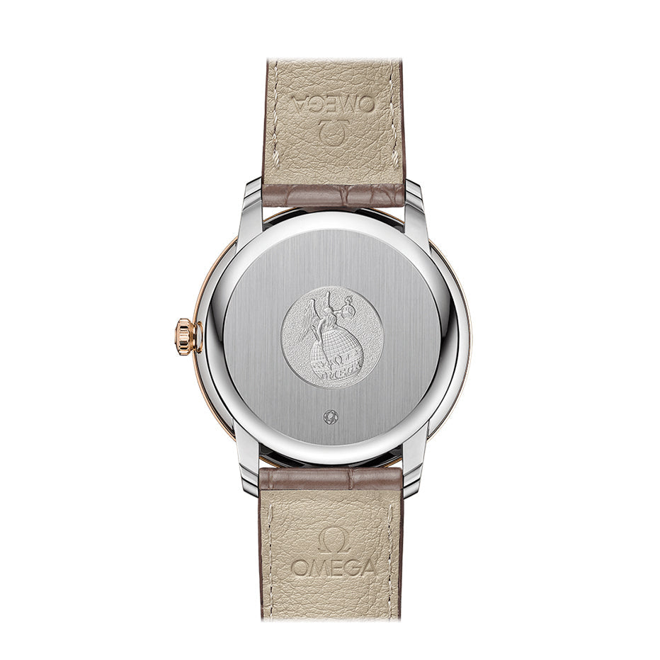 The 39.5 mm case is stainless steel and 18K red gold and is presented on a taupe-brown leather strap. At the heart of this timepiece is the Co-Axial Calibre 2627.