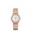 This model features an impressive two-zone white mother-of-pearl dial with diamond indexes and Roman numerals at the 3, 6, 9 and 12 o’clock positions. The striking dial is protected by a scratch-resistant sapphire crystal.