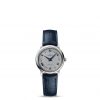 The 27.4 mm case is stainless steel and is presented on a blue leather strap. At the heart of this timepiece is the OMEGA Calibre 1376.