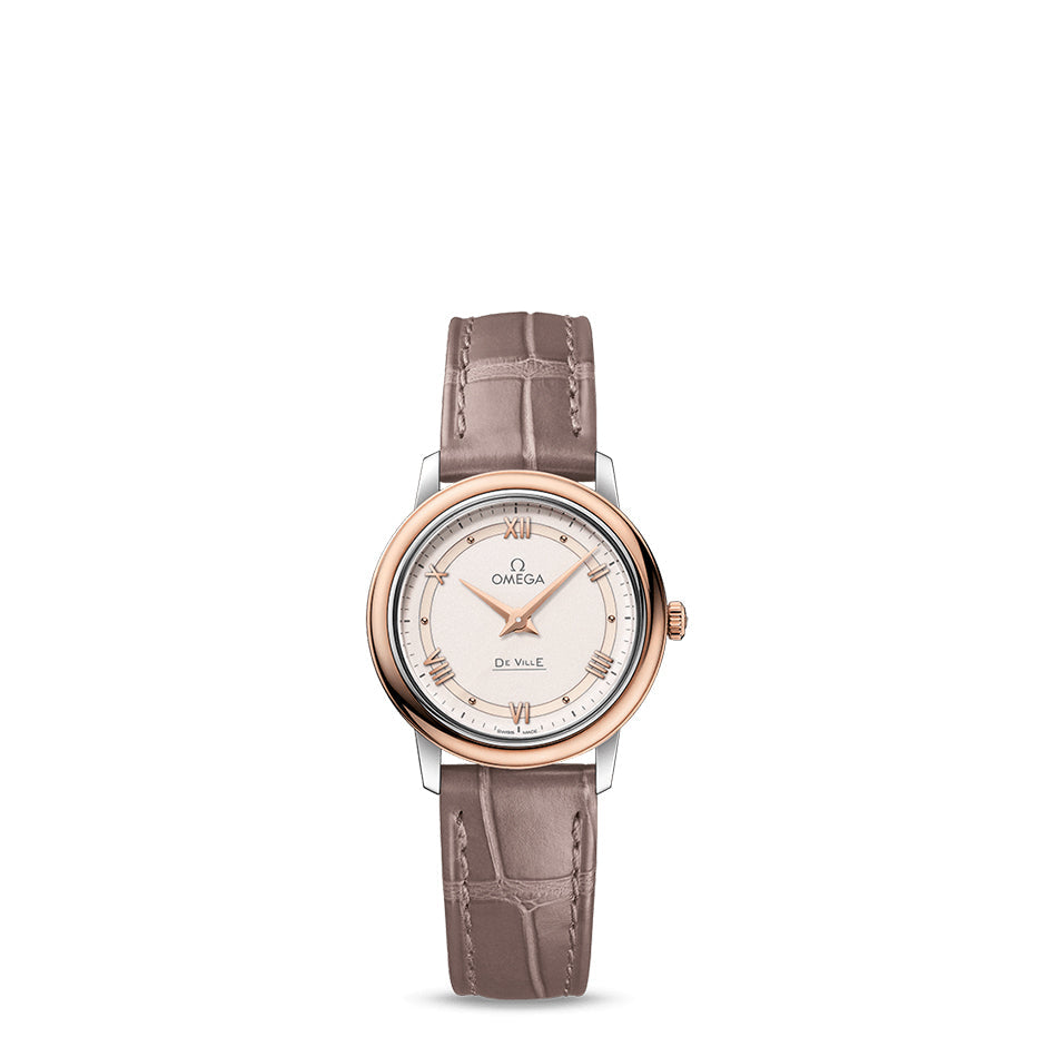 The 27.4 mm 18K red gold and stainless steel case is presented on a taupe-brown leather strap. At the heart of this timepiece is the OMEGA Calibre 1376.