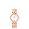 This model features a two-zone, white mother-of-pearl dial with diamond-set indexes and gold-fashioned Roman numerals at the 3, 6, 9 and 12 o’clock positions. A scratch-resistant sapphire crystal covers this striking dial. The diamond-set bezel is mounted on a 27.4 mm 18K red gold case and is presented on an 18K red gold bracelet. This wristwatch is powered by OMEGA’s calibre 1376, a precision quartz movement.