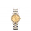 This model features a champagne dial with a silk-like pattern and an opaline finish. The facetted hands are gold-plated and the hour-markers include six gold-plated diamond holders as well as gold-plated Roman numerals.