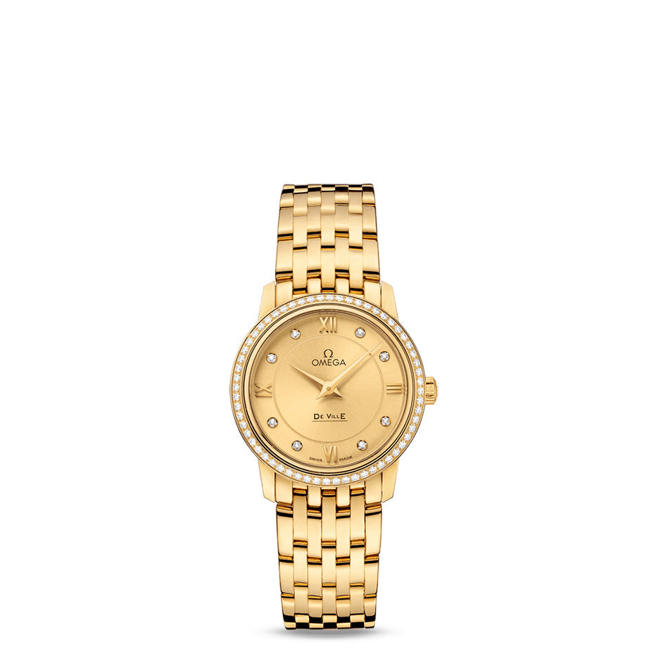 This model features a two-zone champagne dial with diamond-set indexes and gold-fashioned Roman numerals at the 3, 6, 9 and 12 o’clock positions. A scratch-resistant sapphire crystal covers this striking dial. The diamond-set bezel is mounted on a 27.4 mm 18K yellow gold case and is presented on an 18K yellow gold bracelet. This wristwatch is powered by OMEGA’s calibre 1376, a precision quartz movement.
