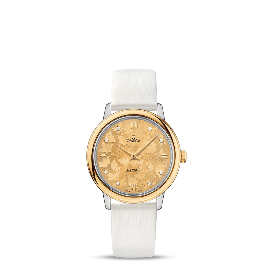 This model features a champagne diamond-set dial with a unique butterfly pattern achieved using a ramolayage, or “pounced ornament”, technique. The 18K yellow gold bezel is mounted on a 32.7 mm stainless steel casebody and presented on a white satin-brushed leather strap. At the heart of this De Ville Prestige “Butterfly” is the OMEGA quartz calibre 4061.