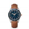 Presented on a brown leather strap, this timepiece includes a transparent sapphire crystal caseback, enabling a clear view of the OMEGA Co-Axial Master Chronometer Calibre 8912.