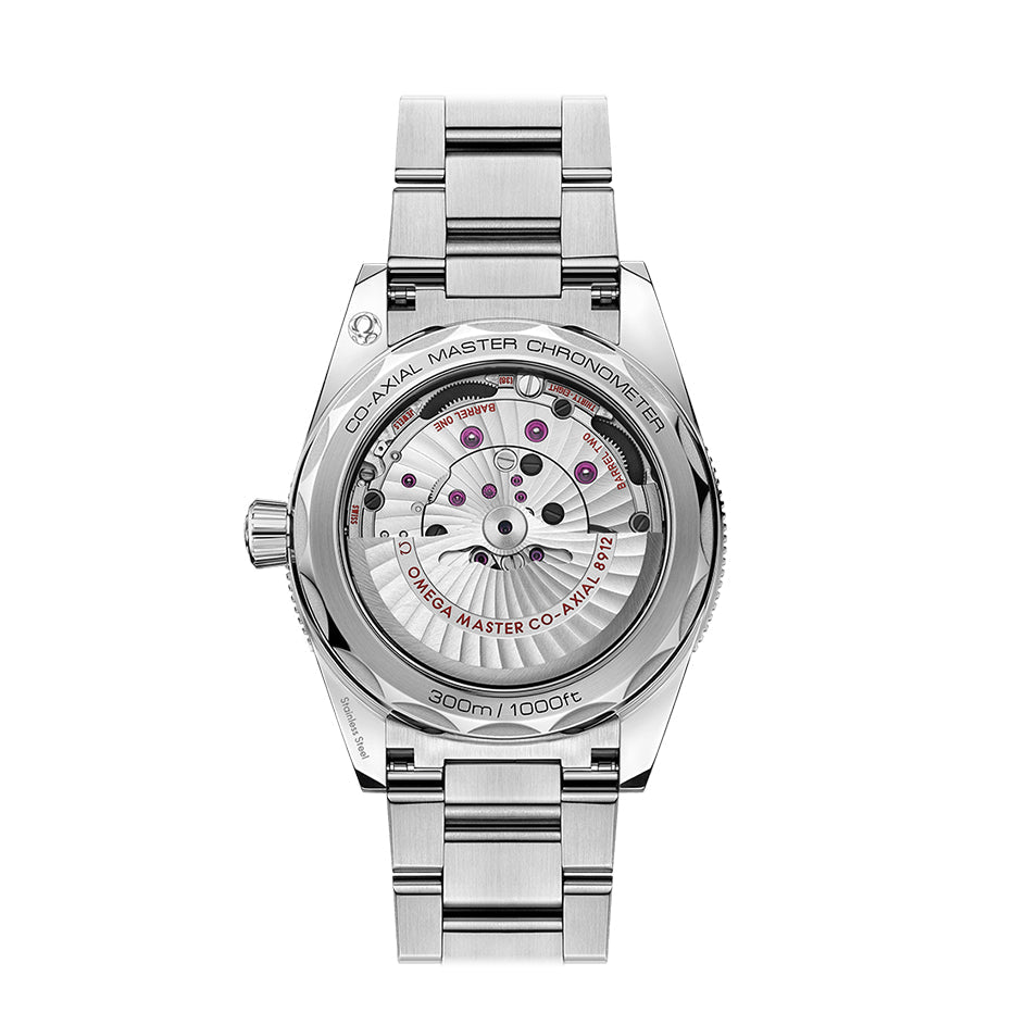 Presented on an ergonomic stainless steel bracelet, this timepiece includes a transparent sapphire crystal caseback, enabling a clear view of the OMEGA Co-Axial Master Chronometer Calibre 8912.