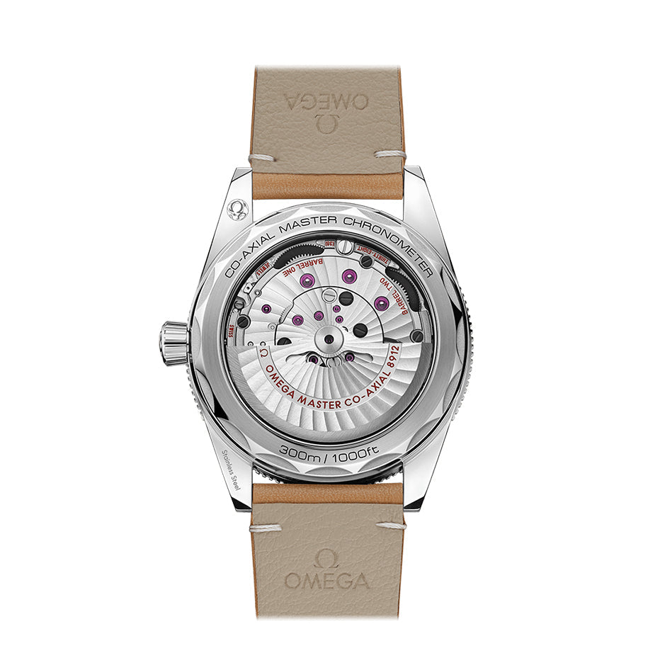 Presented on a beige leather strap, this timepiece includes a transparent sapphire crystal caseback, enabling a clear view of the OMEGA Co-Axial Master Chronometer Calibre 8912.