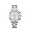 This model features a stainless steel case with a dual bezel design. The inner section of the bezel features a tachymeter scale on a blue aluminium ring while the outside is diamond-paved.