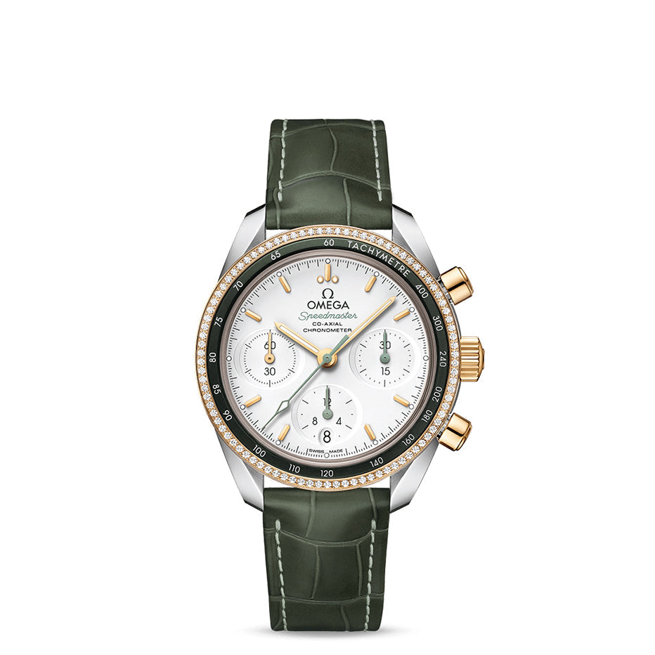 The watch has a green leather strap, a Seahorse medallion on the caseback, and is driven by the OMEGA Co-Axial Calibre 3330.