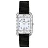 The opaline silvery dial includes horizontal oval subdials and a vertical oval date window at 6 o’clock. The indexes are made of 18K yellow gold while the hands are either 18K yellow gold or varnished green.