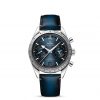 The watch is presented on a blue leather strap with an OMEGA logo in postive relief on the buckle, and is driven by the manual-winding OMEGA Co-Axial Master Chronometer Calibre 9906.