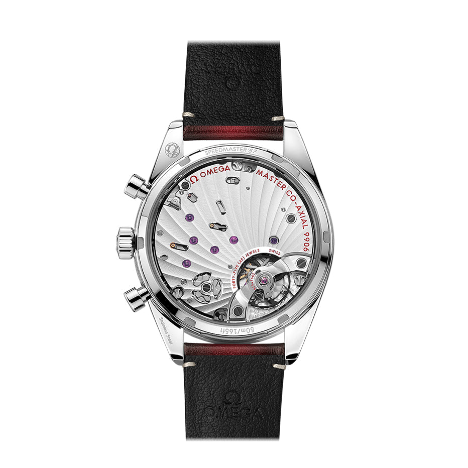 The brushed bezel includes a blackened tachymeter scale, while on the caseback, there is a “Speedmaster ‘57” engraving as well as a flat sapphire crystal with an anti-reflective treatment inside.