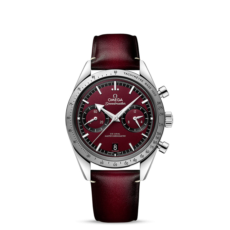 The watch is presented on a burgundy leather strap with an OMEGA logo in postive relief on the buckle, and is driven by the manual-winding OMEGA Co-Axial Master Chronometer Calibre 9906.