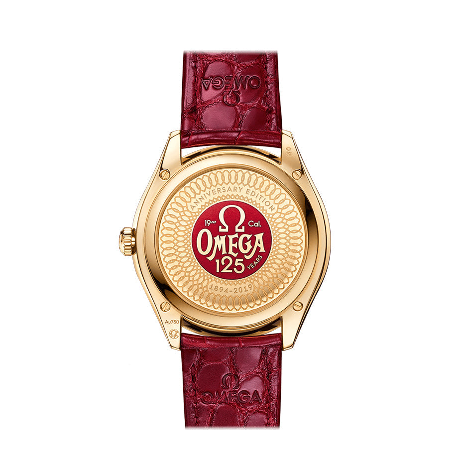 This model celebrates the 125th anniversary of the OMEGA name and has been created with a number of unique touches. The 40mm timepiece includes an 18K yellow gold case with a rare red enamel dial that links to OMEGA’s iconic brand colour, as well as 18K yellow gold domed indexes and hands. The caseback includes an 18K yellow gold anniversary medallion filled with red enamel. This is surrounded by a traditional engraving known as damaskeeing – the same that was originally used on some 19-ligne calibres.