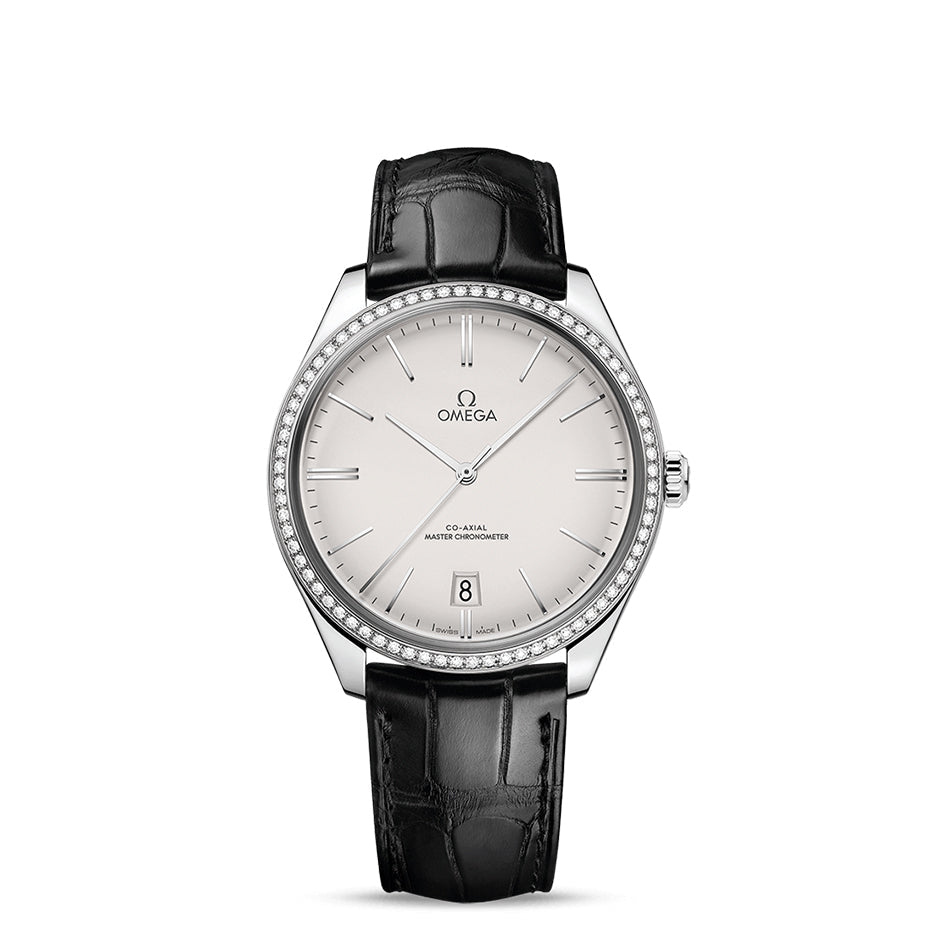 This model has a 40 mm stainless steel case with a diamond-paved bezel and is presented on a black leather strap. The domed opaline silvery dial includes a date window at 6 o’clock as well as hands and indexes in 18K white gold.