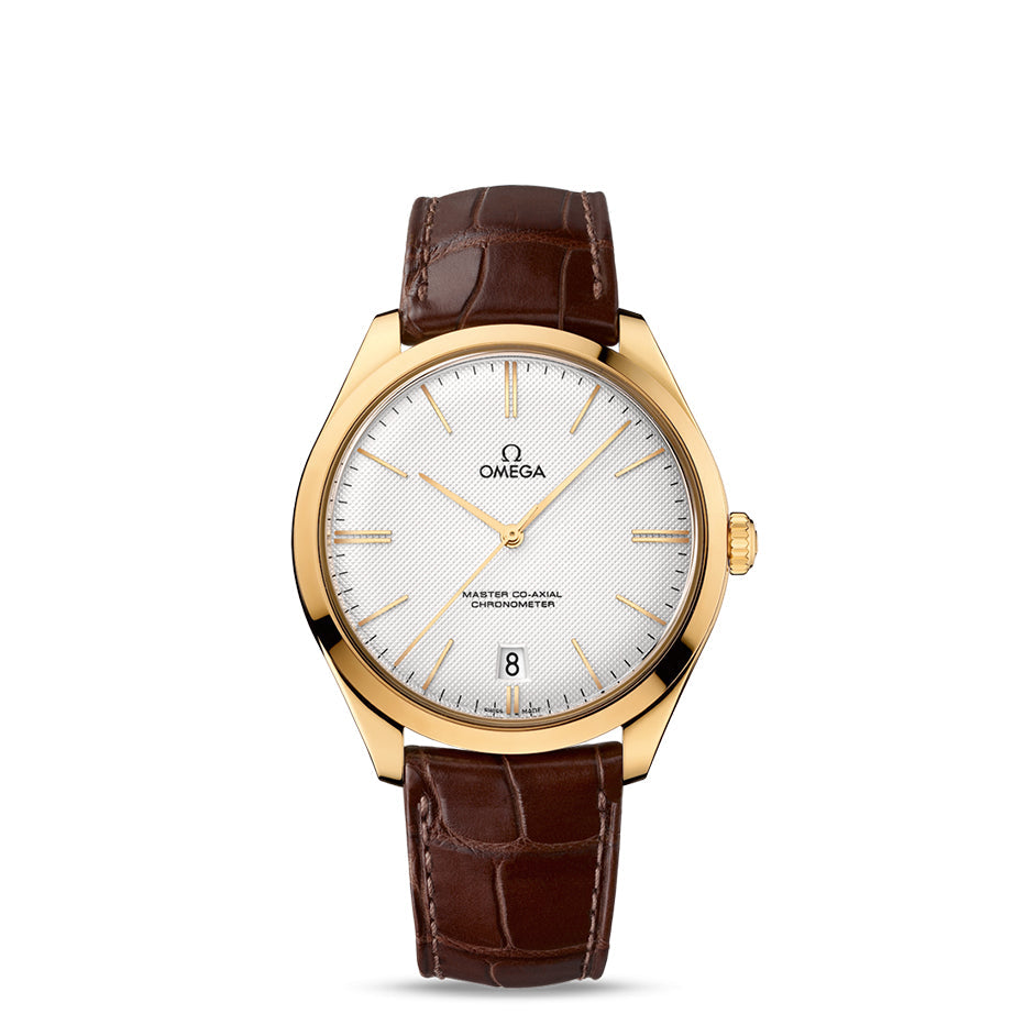 This model has a silvery opaline dial with a domed vintage “clous de Paris” structure and a date window at 6 o’clock. The 40 mm 18K yellow gold case is presented on a brown leather strap with an 18K yellow gold buckle. This De Ville Trésor is powered by the anti-magnetic OMEGA Master Co-Axial calibre 8511 – a unique manual winding movement.