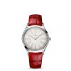 For this model, the slim 36 mm case is crafted in stainless steel and features 38 full-cut diamonds, which curve elegantly along each side. The opaline silvery dial includes embossed rhodium-plated Roman numerals, while the crown features a single diamond, this time surrounded by a red ceramic flower made from five OMEGA logos.