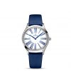 The slim 36 mm case is made from stainless steel and features diamond paving that curves along each side, as well as a crown that is polished with red “HyCeram” and set with a single diamond. The lacquered white dial includes unique transferred Roman numerals in blue and elegant blued hands.