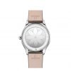 The slim 39 mm case is made from stainless steel and features diamond paving that curves along each side, as well as a crown that is polished with red “HyCeram” and set with a single diamond. The lacquered taupe-brown dial includes unique transferred Roman numerals, while the hands are rhodium-plated.