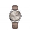 The slim 39 mm case is made from stainless steel and features diamond paving that curves along each side, as well as a crown that is polished with red “HyCeram” and set with a single diamond. The lacquered taupe-brown dial includes unique transferred Roman numerals, while the hands are rhodium-plated.