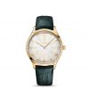 The slim 39 mm case is made from 18K Moonshine™ gold and features diamond paving that curves along each side, as well as a crown that is polished with red liquid ceramic and set with a single diamond. The lacquered opaline silver dial features an 18K Moonshine™ gold base that is seen in the Roman numerals and embossed silk-like pattern.