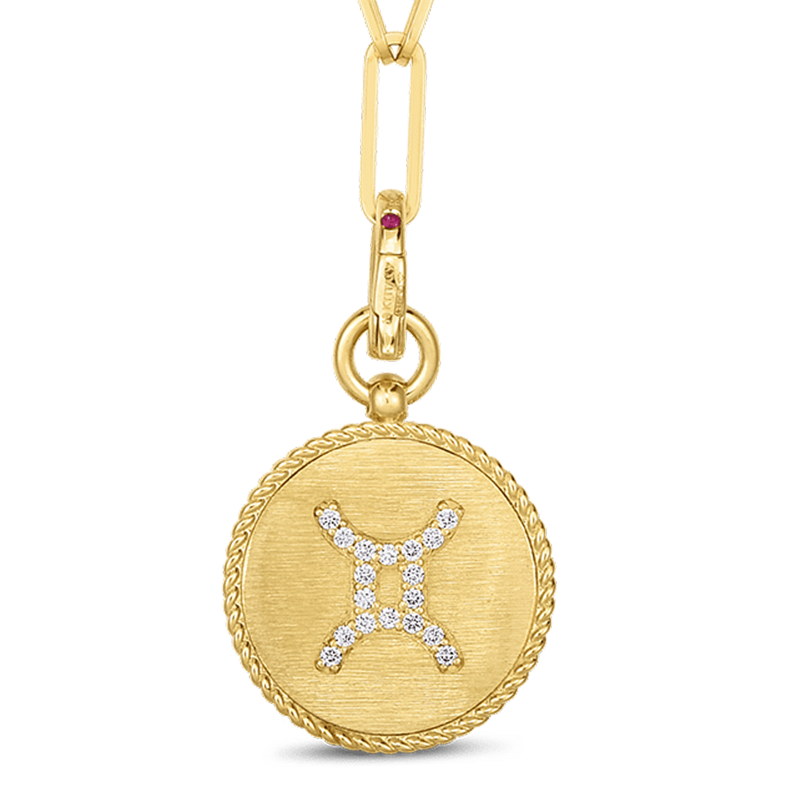 PENDANT FEATURES DIAMOND ZODIAC SYMBOL ON THE FRONT & DIAMOND PRINCESS PATTERN ON BACK SIDE. MEDALLION MEASURES APPROX 17MM AT WIDEST POINT AND HAS A CLASP ENABLING YOU TO ATTACH WHERE YOU LIKE ON OUR 19″ PAPER-CLIP CHAIN.