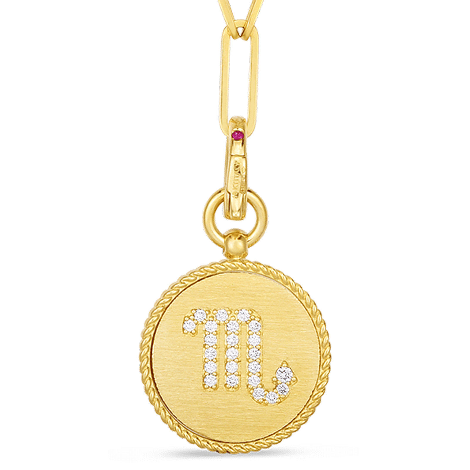 PENDANT FEATURES DIAMOND ZODIAC SYMBOL ON THE FRONT & DIAMOND PRINCESS PATTERN ON BACK SIDE. MEDALLION MEASURES APPROX 17MM AT WIDEST POINT AND HAS A CLASP ENABLING YOU TO ATTACH WHERE YOU LIKE ON OUR 19″ PAPER-CLIP CHAIN.