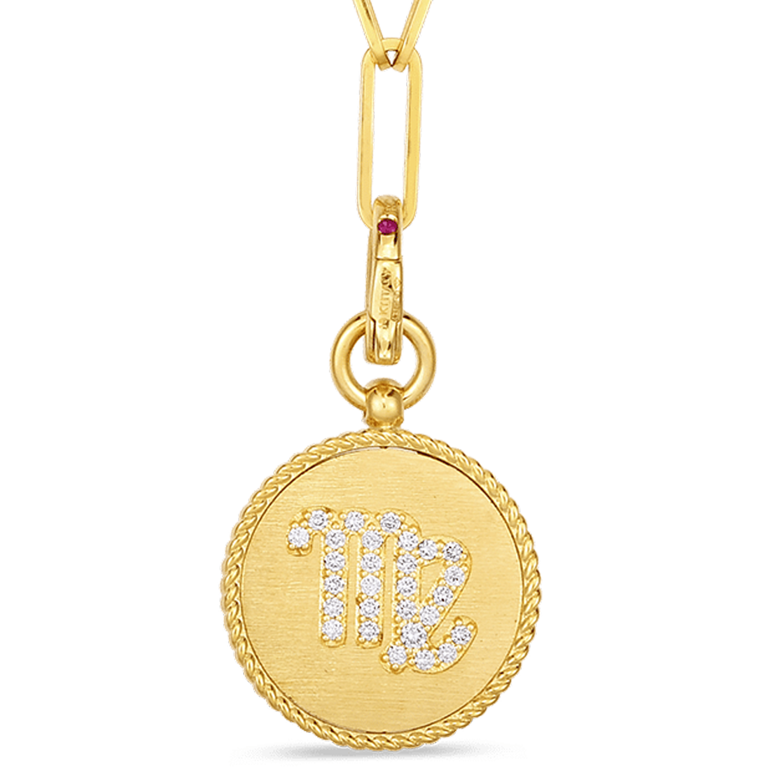 PENDANT FEATURES DIAMOND ZODIAC SYMBOL ON THE FRONT & DIAMOND PRINCESS PATTERN ON BACK SIDE. MEDALLION MEASURES APPROX 17MM AT WIDEST POINT AND HAS A CLASP ENABLING YOU TO ATTACH WHERE YOU LIKE ON OUR 19″ PAPER-CLIP CHAIN.