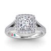 Classic 14K engagement cushion halo ring with split shank in 2ct cushion center lab grown diamonds and 2.50ct total weight.