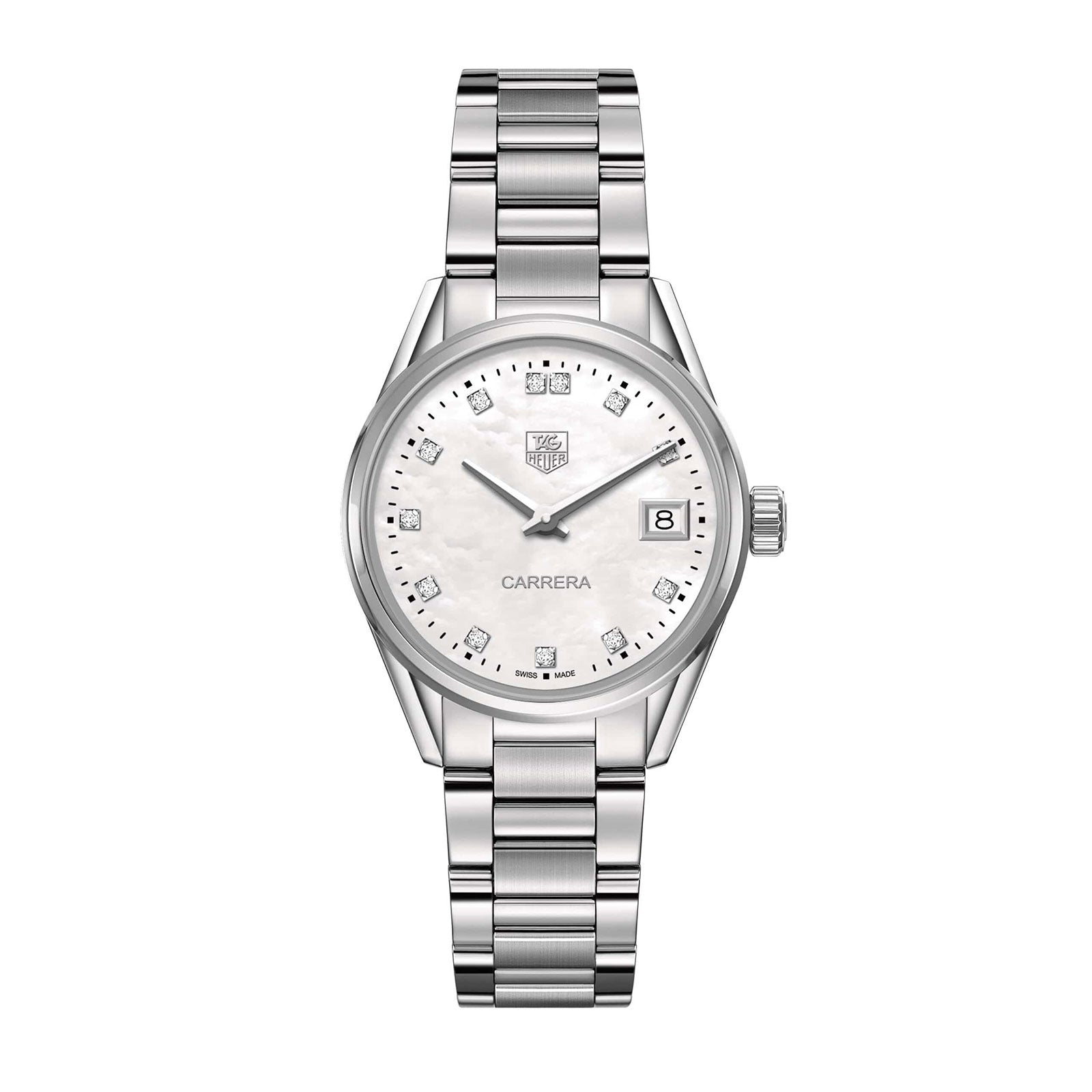 - Bezel: Polished steel ; White mother of pearl dial with 13 diamonds