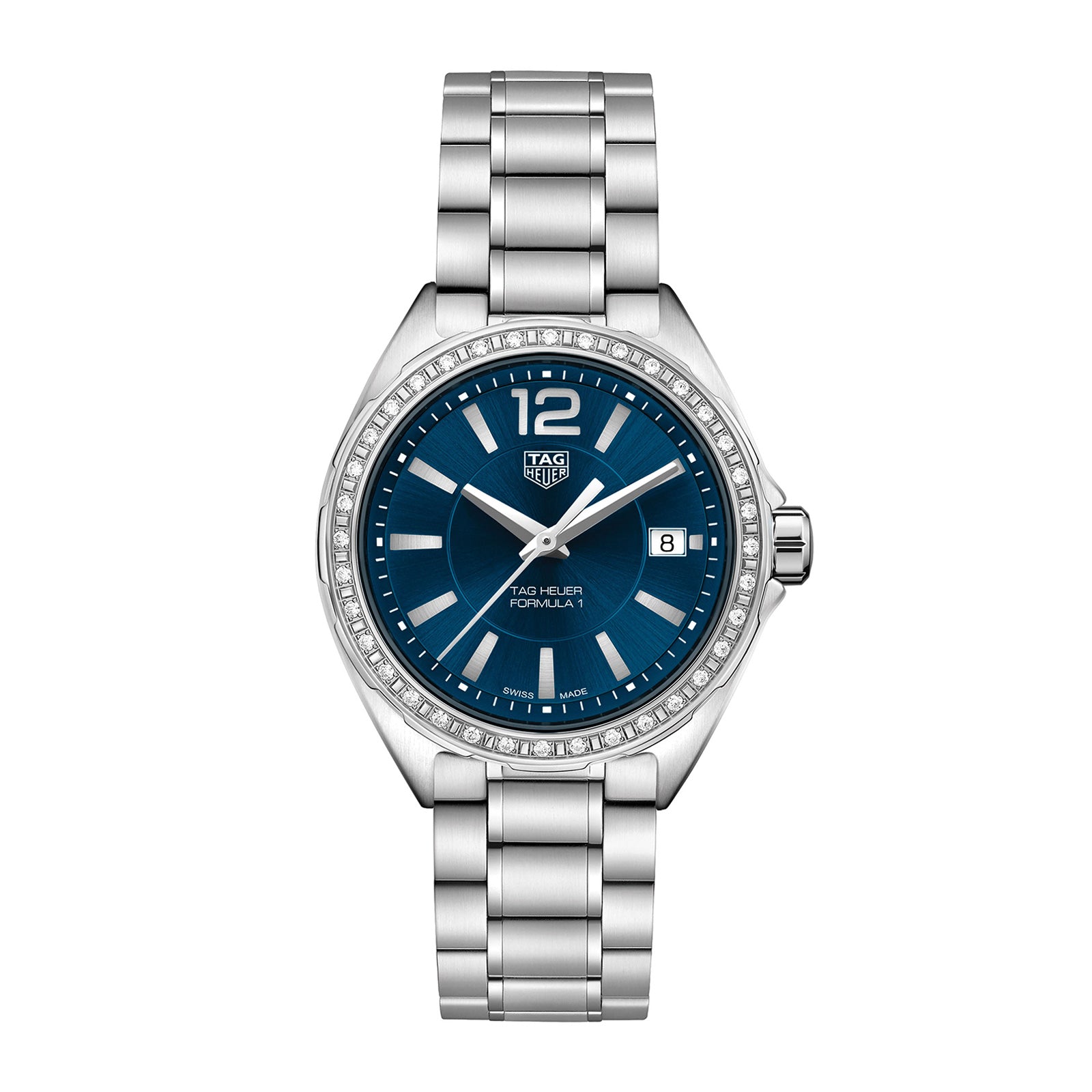 - Bezel: steel polished fixed bezel with diamonds / blue sunray brushed dial with 60 second/minute scale / Battery Powerred
