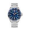 - Bezel: Unidirectional black titanium carbide coated steel turning bezel with raised fine-brushed shield and numerals / White dial with printed minuterie on the flange / Battery Powerred