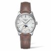 The unique Longines Master Collection automatic watch features a round 34.00mm stainless steel case and water resistance up to 30 meters (100 feet). This watch is enhanced with a white mother-of-pearl dial, diamond indicators and sapphire crystal. The functionality of this timepiece includes hours, minutes, seconds, and date and moonphase at 6 o’clock Explore the Longines L24094874.