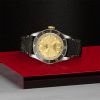 - Bezel: Unidirectional rotating bezel in yellow gold with 60-minute graduated matte black anodized aluminum disk gold markings